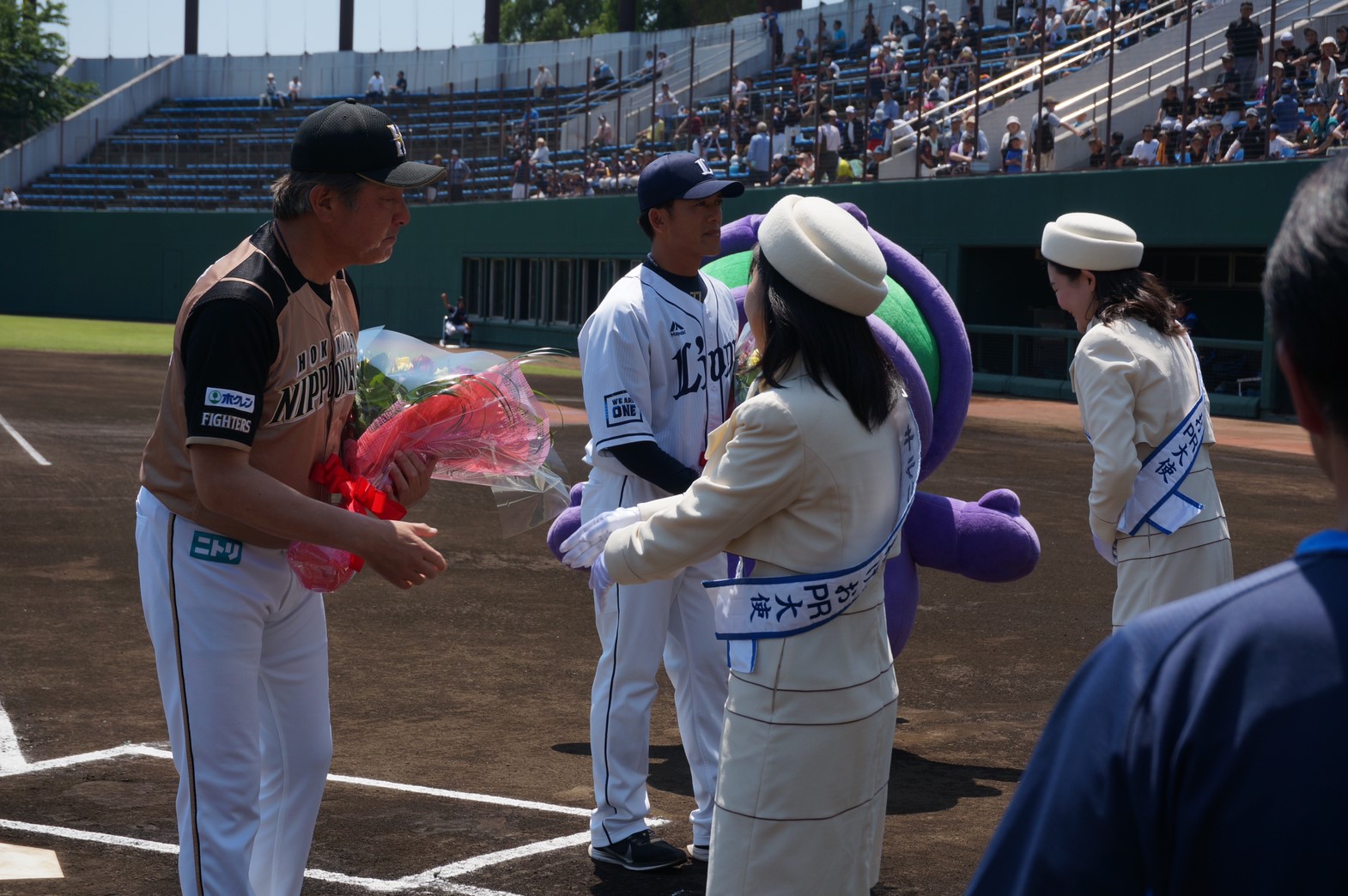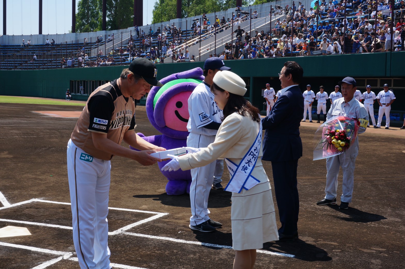 日本ハムファイターズの荒木大輔監督と西武ライオンズの松井稼頭央監督に花束と上尾市の推奨土産品であるフルーツトマトを贈呈させていただきました。